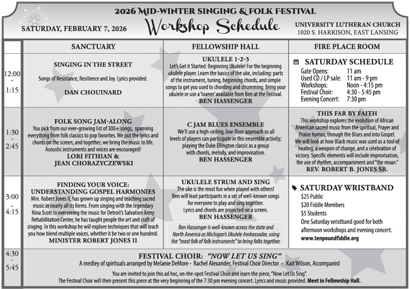 Noon - 5:45 pm, eight singing and non-singing workshops + festival choir